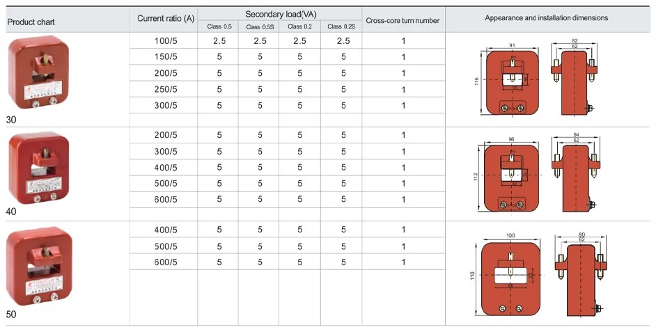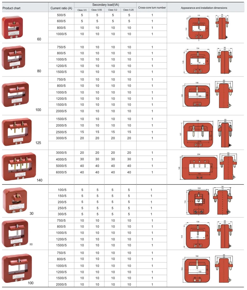 মডেল রেট করা বর্তমান অনুপাত(A) বাস বার ফিড-থ্রু বাঁক সঠিক স্তর এবং রেটেড আউটপুট(VA)COSφ = 0.8 রেটেড ইনসুলেটন স্তর (kV)